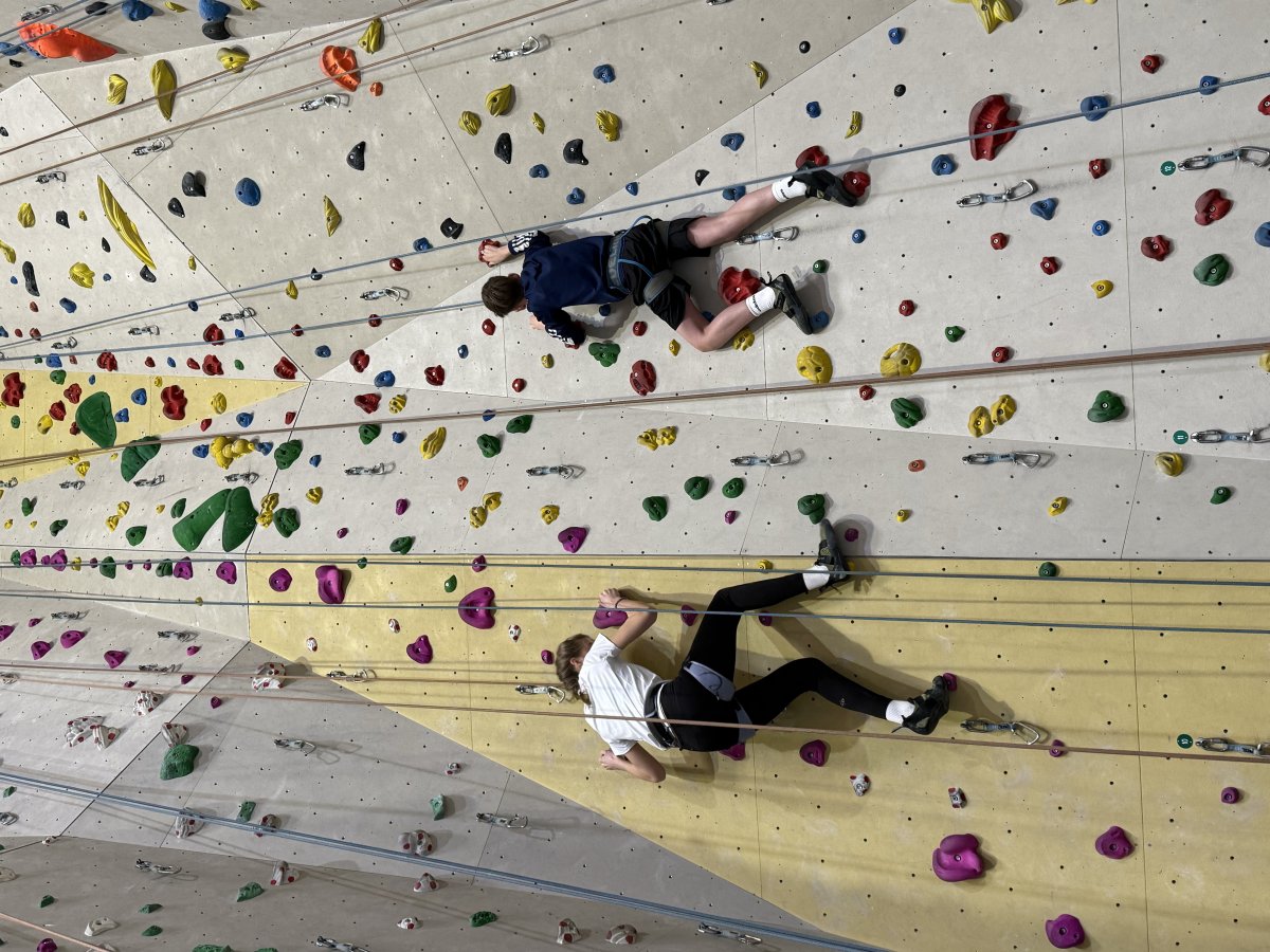 Dort angekommen, haben wir erstmal extra Kletterschuhe und eine Einführung bekommen. Danach durften wir endlich selbst losklettern! In dreier Gruppen durften wir uns selbst an den verschiedenen Kletterwänden ausprobieren. Beim Klettern aber auch beim gegenseitigen Sichern, hatten wir alle eine Menge Spaß. Einige Routen waren echt schwer, weshalb wir nach dem Ausflug in die Kletterhalle alle mit schweren Amen zurück in die Jugendherberge liefen und uns direkt auf die Semmelknödel mit Pilzsoße stürmten.