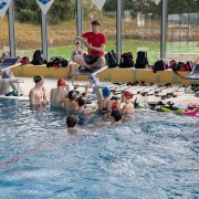 Anschließend startete das erste Training mit dem Titel „Fallschirm“. Dabei schwammen wir mit Fallschirmen, was deutlich anstrengender war. Zusätzlich übten wir intensiv die Tauchphase und das Gleiten, und verbesserten damit unsere Streamline Form.
